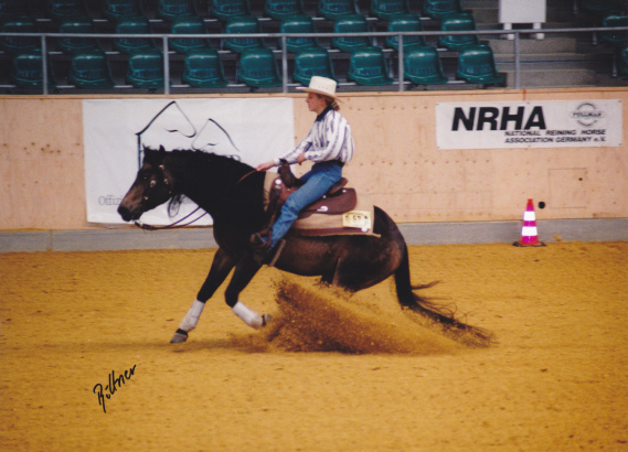 Ich trainierte fleißig, bis ich mit 12 Jahren an meinem ersten NRHA Turnier teilnahm. Die 4-jährige Quarter Horse Stute „Hickorys Poco Dee“ (Enkelin von Doc Bar und Tochter von Hickorys Hankette) war mein erstes Showpferd.